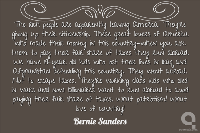 The rich people are apparently leaving America. They're giving up their citizenship. These great lovers of America who made their money in this country-when you ask them to pay their fair share of taxes they run abroad. We have 19-year old kids who lost their lives in Iraq and Afghanistan defending this country. They went abroad. Not to escape taxes. They're working class kids who died in wars and now billionaires want to run abroad to avoid paying their fair share of taxes. What patriotism! What love of country!