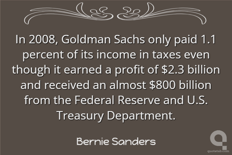 In 2008, Goldman Sachs only paid 1.1 percent of its income in taxes even though it earned a profit of $2.3 billion and received an almost $800 billion from the Federal Reserve and U.S. Treasury Department.
