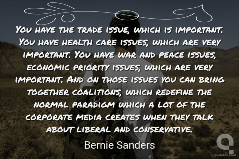 You have the trade issue, which is important. You have health care issues, which are very important. You have war and peace issues, economic priority issues, which are very important. And on those issues you can bring together coalitions, which redefine the normal paradigm which a lot of the corporate media creates when they talk about liberal and conservative.