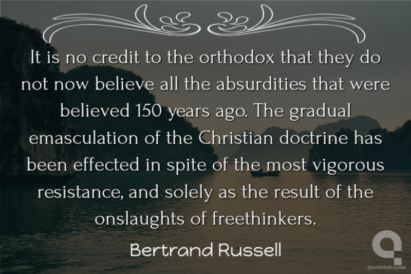 It is no credit to the orthodox that they do not now believe all the absurdities that were believed 150 years ago. The gradual emasculation of the Christian doctrine has been effected in spite of the most vigorous resistance, and solely as the result of the onslaughts of freethinkers.