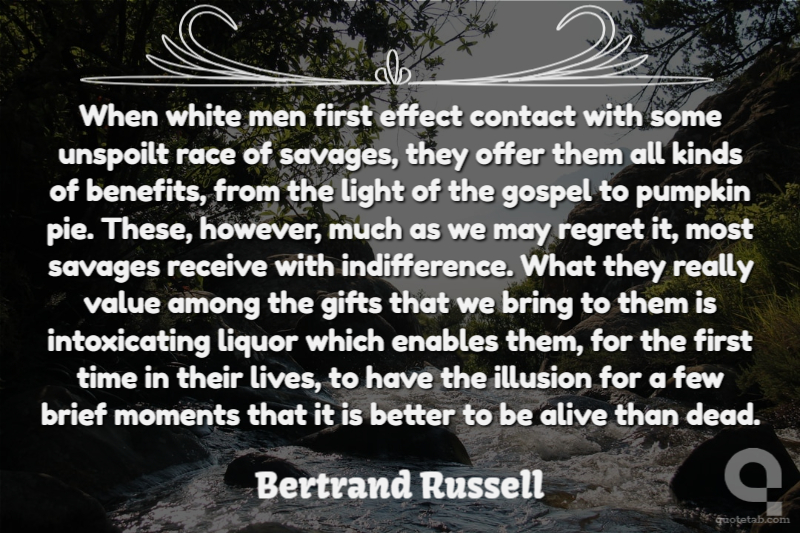 When white men first effect contact with some unspoilt race of savages, they offer them all kinds of benefits, from the light of the gospel to pumpkin pie. These, however, much as we may regret it, most savages receive with indifference. What they really value among the gifts that we bring to them is intoxicating liquor which enables them, for the first time in their lives, to have the illusion for a few brief moments that it is better to be alive than dead.