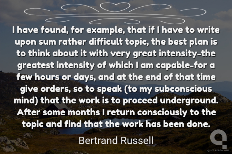 I have found, for example, that if I have to write upon sum rather difficult topic, the best plan is to think about it with very great intensity-the greatest intensity of which I am capable-for a few hours or days, and at the end of that time give orders, so to speak (to my subconscious mind) that the work is to proceed underground. After some months I return consciously to the topic and find that the work has been done.