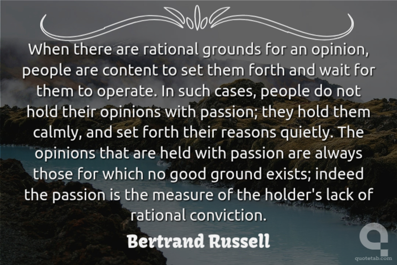 When there are rational grounds for an opinion, people are content to set them forth and wait for them to operate. In such cases, people do not hold their opinions with passion; they hold them calmly, and set forth their reasons quietly. The opinions that are held with passion are always those for which no good ground exists; indeed the passion is the measure of the holder's lack of rational conviction.