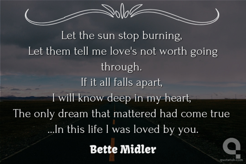 Let the sun stop burning, Let them tell me love's not worth going through. If it all falls apart, I will know deep in my heart, The only dream that mattered had come true ...In this life I was loved by you.