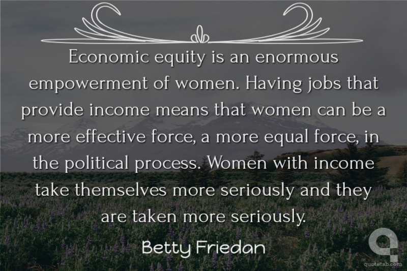 Economic equity is an enormous empowerment of women. Having jobs that provide income means that women can be a more effective force, a more equal force, in the political process. Women with income take themselves more seriously and they are taken more seriously.