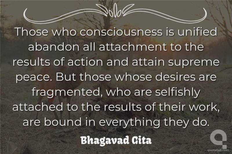 Those who consciousness is unified abandon all attachment to the results of action and attain supreme peace. But those whose desires are fragmented, who are selfishly attached to the results of their work, are bound in everything they do.