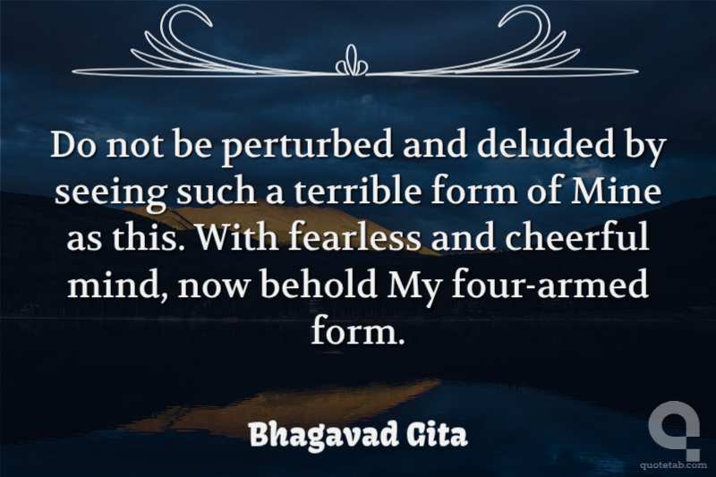 Do not be perturbed and deluded by seeing such a terrible form of Mine as this. With fearless and cheerful mind, now behold My four-armed form.