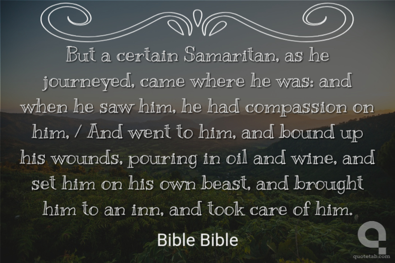 But a certain Samaritan, as he journeyed, came where he was: and when he saw him, he had compassion on him, / And went to him, and bound up his wounds, pouring in oil and wine, and set him on his own beast, and brought him to an inn, and took care of him.