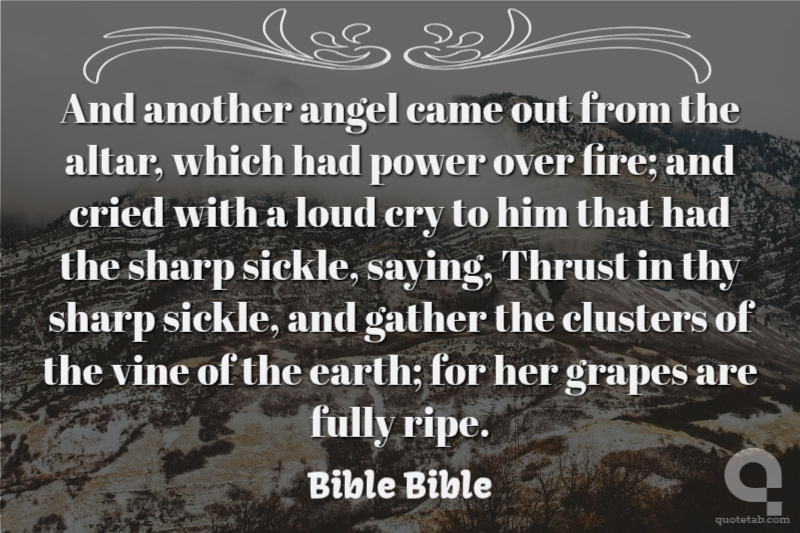 And another angel came out from the altar, which had power over fire; and cried with a loud cry to him that had the sharp sickle, saying, Thrust in thy sharp sickle, and gather the clusters of the vine of the earth; for her grapes are fully ripe.