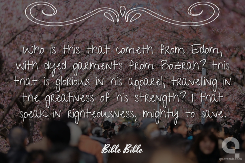 Who is this that cometh from Edom, with dyed garments from Bozrah? this that is glorious in his apparel, travelling in the greatness of his strength? I that speak in righteousness, mighty to save.