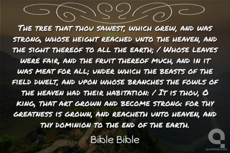 The tree that thou sawest, which grew, and was strong, whose height reached unto the heaven, and the sight thereof to all the earth; / Whose leaves were fair, and the fruit thereof much, and in it was meat for all; under which the beasts of the field dwelt, and upon whose branches the fowls of the heaven had their habitation: / It is thou, O king, that art grown and become strong: for thy greatness is grown, and reacheth unto heaven, and thy dominion to the end of the earth.