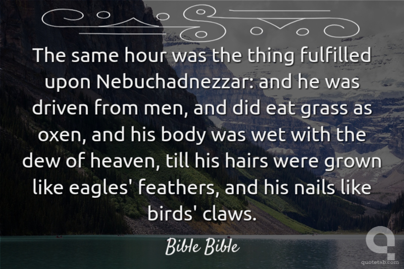 The same hour was the thing fulfilled upon Nebuchadnezzar: and he was driven from men, and did eat grass as oxen, and his body was wet with the dew of heaven, till his hairs were grown like eagles' feathers, and his nails like birds' claws.