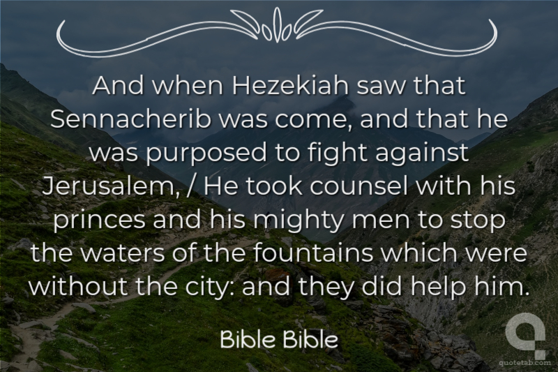 And when Hezekiah saw that Sennacherib was come, and that he was purposed to fight against Jerusalem, / He took counsel with his princes and his mighty men to stop the waters of the fountains which were without the city: and they did help him.