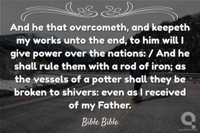 And he that overcometh, and keepeth my works unto the end, to him will I give power over the nations: / And he shall rule them with a rod of iron; as the vessels of a potter shall they be broken to shivers: even as I received of my Father.