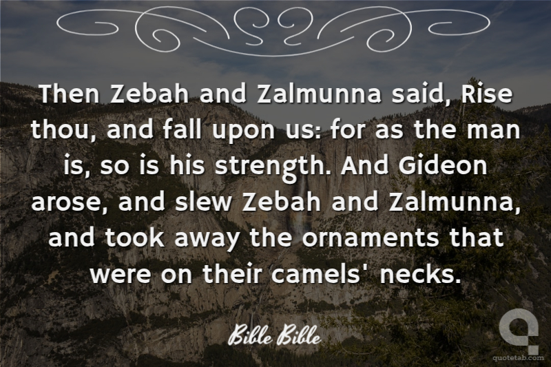 Then Zebah and Zalmunna said, Rise thou, and fall upon us: for as the man is, so is his strength. And Gideon arose, and slew Zebah and Zalmunna, and took away the ornaments that were on their camels' necks.