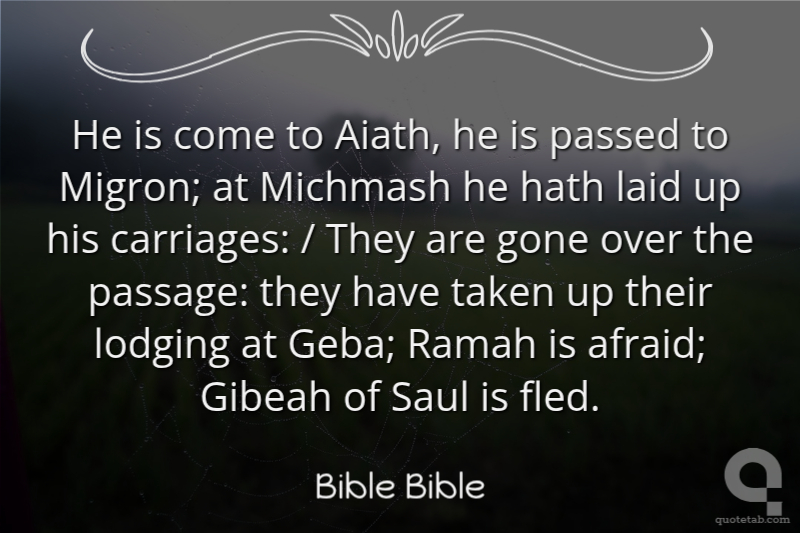 He is come to Aiath, he is passed to Migron; at Michmash he hath laid up his carriages: / They are gone over the passage: they have taken up their lodging at Geba; Ramah is afraid; Gibeah of Saul is fled.