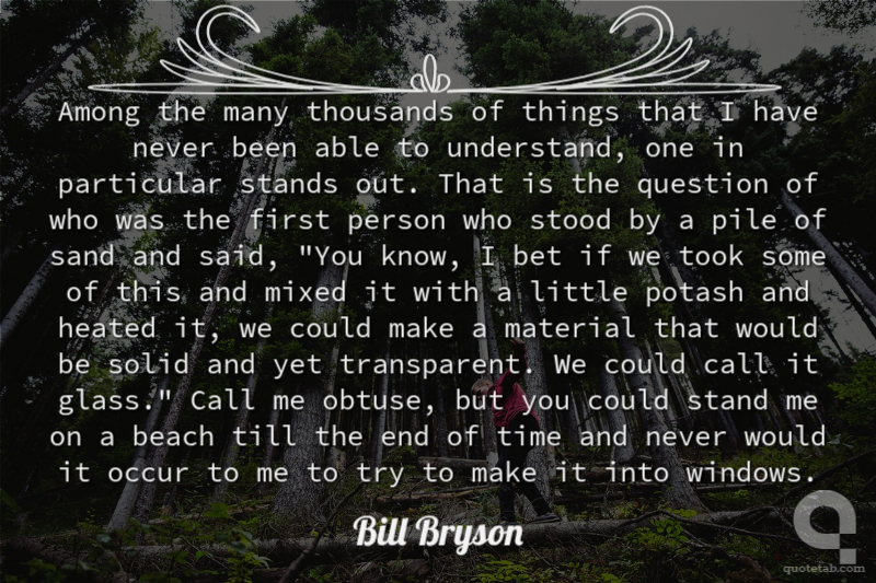 Among the many thousands of things that I have never been able to understand, one in particular stands out. That is the question of who was the first person who stood by a pile of sand and said, "You know, I bet if we took some of this and mixed it with a little potash and heated it, we could make a material that would be solid and yet transparent. We could call it glass." Call me obtuse, but you could stand me on a beach till the end of time and never would it occur to me to try to make it into windows.