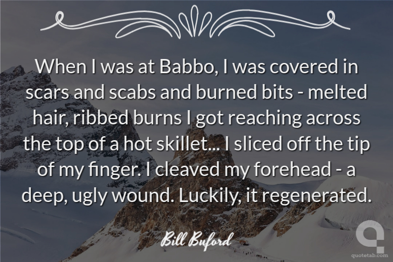 When I was at Babbo, I was covered in scars and scabs and burned bits - melted hair, ribbed burns I got reaching across the top of a hot skillet... I sliced off the tip of my finger. I cleaved my forehead - a deep, ugly wound. Luckily, it regenerated.