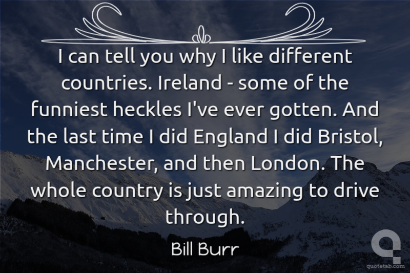 I can tell you why I like different countries. Ireland - some of the funniest heckles I've ever gotten. And the last time I did England I did Bristol, Manchester, and then London. The whole country is just amazing to drive through.