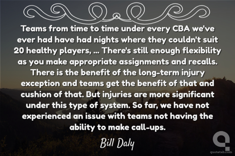 Teams from time to time under every CBA we've ever had have had nights where they couldn't suit 20 healthy players, ... There's still enough flexibility as you make appropriate assignments and recalls. There is the benefit of the long-term injury exception and teams get the benefit of that and cushion of that. But injuries are more significant under this type of system. So far, we have not experienced an issue with teams not having the ability to make call-ups.