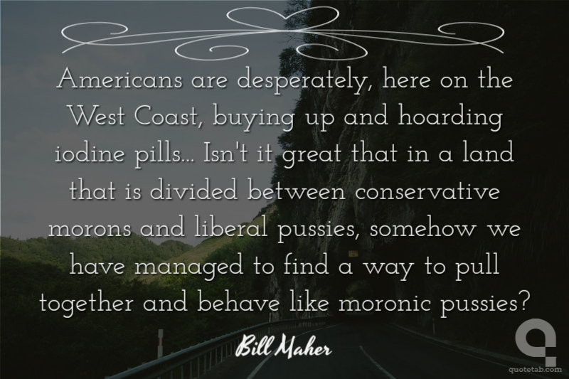 Americans are desperately, here on the West Coast, buying up and hoarding iodine pills... Isn't it great that in a land that is divided between conservative morons and liberal pussies, somehow we have managed to find a way to pull together and behave like moronic pussies?