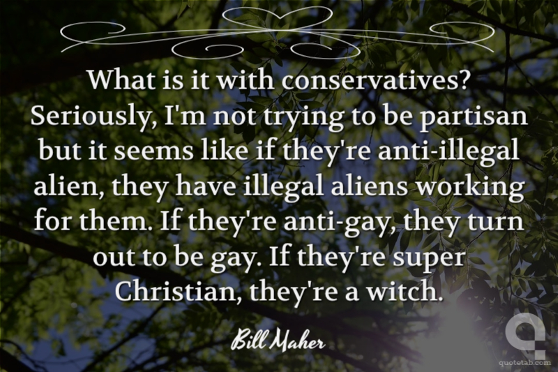 What is it with conservatives? Seriously, I'm not trying to be partisan but it seems like if they're anti-illegal alien, they have illegal aliens working for them. If they're anti-gay, they turn out to be gay. If they're super Christian, they're a witch.