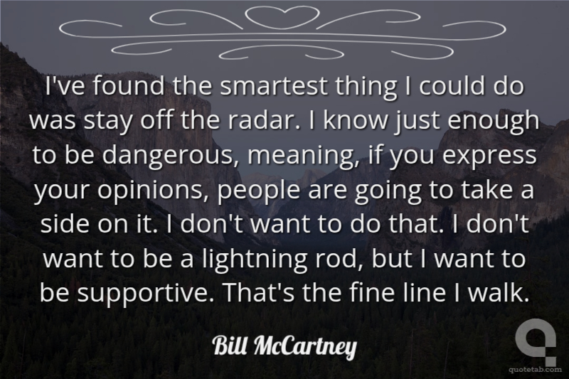 I've found the smartest thing I could do was stay off the radar. I know just enough to be dangerous, meaning, if you express your opinions, people are going to take a side on it. I don't want to do that. I don't want to be a lightning rod, but I want to be supportive. That's the fine line I walk.