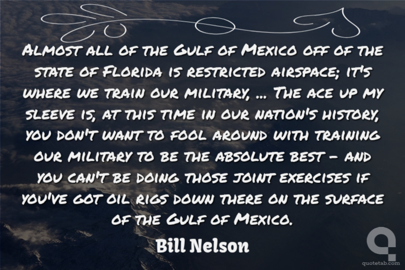 Almost all of the Gulf of Mexico off of the state of Florida is restricted airspace; it's where we train our military, ... The ace up my sleeve is, at this time in our nation's history, you don't want to fool around with training our military to be the absolute best - and you can't be doing those joint exercises if you've got oil rigs down there on the surface of the Gulf of Mexico.
