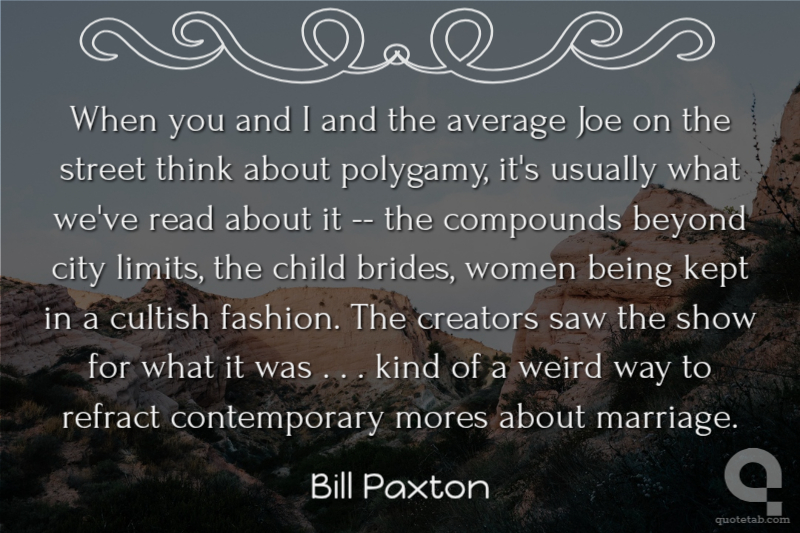 When you and I and the average Joe on the street think about polygamy, it's usually what we've read about it -- the compounds beyond city limits, the child brides, women being kept in a cultish fashion. The creators saw the show for what it was . . . kind of a weird way to refract contemporary mores about marriage.