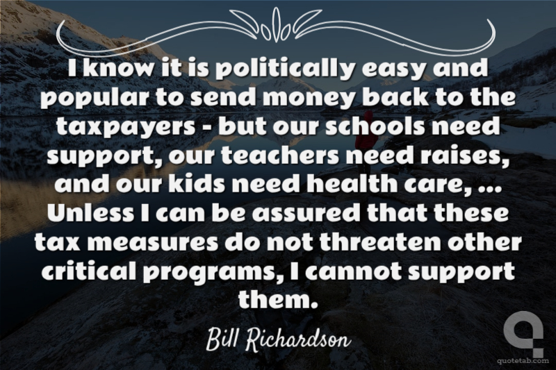 I know it is politically easy and popular to send money back to the taxpayers - but our schools need support, our teachers need raises, and our kids need health care, ... Unless I can be assured that these tax measures do not threaten other critical programs, I cannot support them.