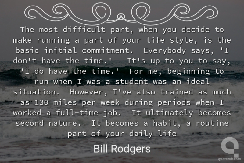 The most difficult part, when you decide to make running a part of your life style, is the basic initial commitment. Everybody says, 'I don't have the time.' It's up to you to say, 'I do have the time.' For me, beginning to run when I was a student was an ideal situation. However, I've also trained as much as 130 miles per week during periods when I worked a full-time job. It ultimately becomes second nature. It becomes a habit, a routine part of your daily life