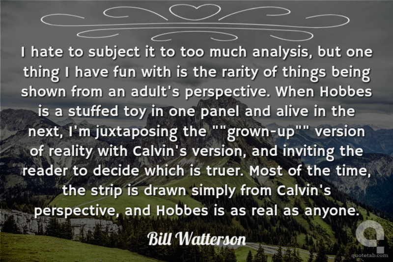 I hate to subject it to too much analysis, but one thing I have fun with is the rarity of things being shown from an adult's perspective. When Hobbes is a stuffed toy in one panel and alive in the next, I'm juxtaposing the ""grown-up"" version of reality with Calvin's version, and inviting the reader to decide which is truer. Most of the time, the strip is drawn simply from Calvin's perspective, and Hobbes is as real as anyone.