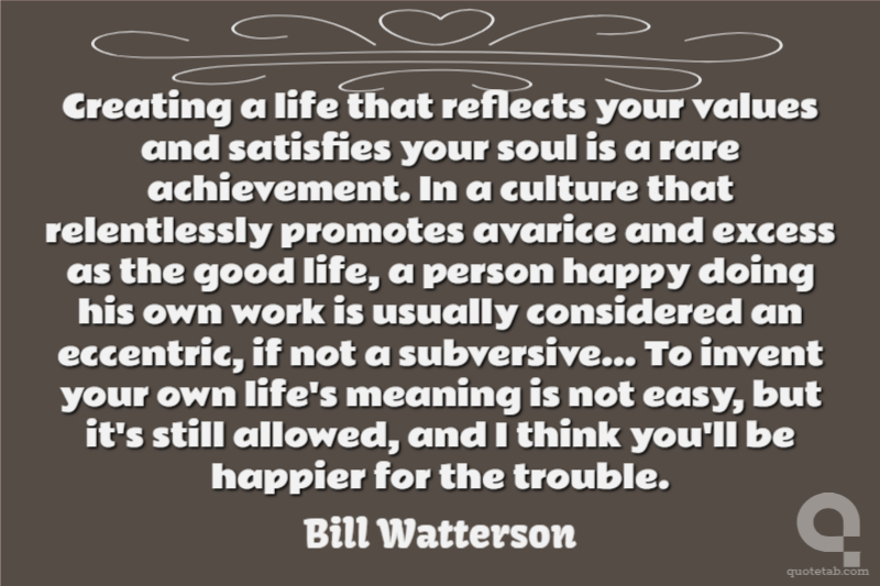Creating a life that reflects your values and satisfies your soul is a rare achievement. In a culture that relentlessly promotes avarice and excess as the good life, a person happy doing his own work is usually considered an eccentric, if not a subversive... To invent your own life's meaning is not easy, but it's still allowed, and I think you'll be happier for the trouble.