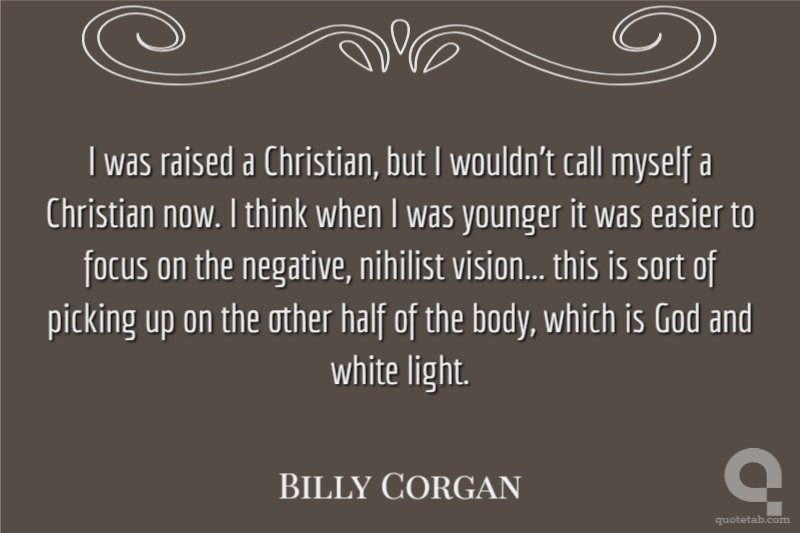 I was raised a Christian, but I wouldn't call myself a Christian now. I think when I was younger it was easier to focus on the negative, nihilist vision... this is sort of picking up on the other half of the body, which is God and white light.