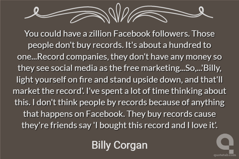You could have a zillion Facebook followers. Those people don't buy records. It's about a hundred to one...Record companies, they don't have any money so they see social media as the free marketing...So,...'Billy, light yourself on fire and stand upside down, and that'll market the record'. I've spent a lot of time thinking about this. I don't think people by records because of anything that happens on Facebook. They buy records cause they're friends say 'I bought this record and I love it'.