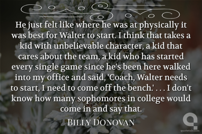 He just felt like where he was at physically it was best for Walter to start. I think that takes a kid with unbelievable character, a kid that cares about the team, a kid who has started every single game since he's been here walked into my office and said, 'Coach, Walter needs to start, I need to come off the bench.' . . . I don't know how many sophomores in college would come in and say that.