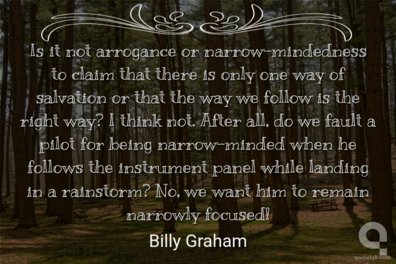 Is it not arrogance or narrow-mindedness to claim that there is only one way of salvation or that the way we follow is the right way? I think not. After all, do we fault a pilot for being narrow-minded when he follows the instrument panel while landing in a rainstorm? No, we want him to remain narrowly focused!