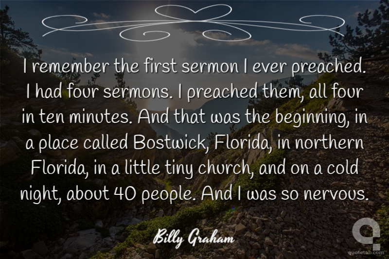 I remember the first sermon I ever preached. I had four sermons. I preached them, all four in ten minutes. And that was the beginning, in a place called Bostwick, Florida, in northern Florida, in a little tiny church, and on a cold night, about 40 people. And I was so nervous.