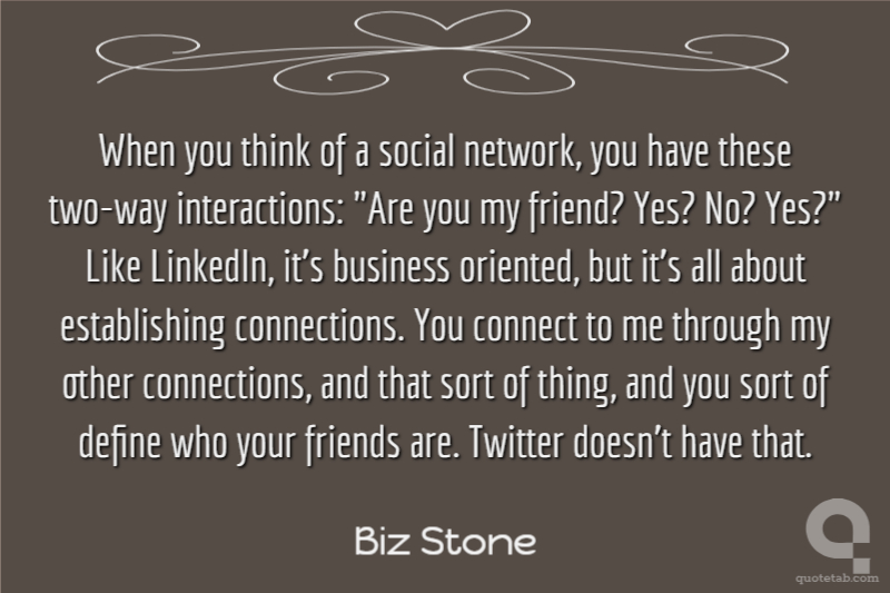 When you think of a social network, you have these two-way interactions: "Are you my friend? Yes? No? Yes?" Like LinkedIn, it's business oriented, but it's all about establishing connections. You connect to me through my other connections, and that sort of thing, and you sort of define who your friends are. Twitter doesn't have that.