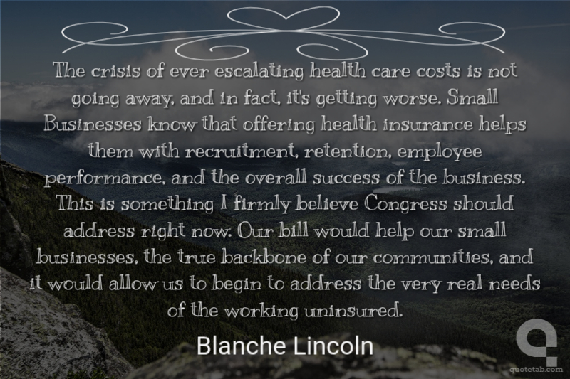 The crisis of ever escalating health care costs is not going away, and in fact, it's getting worse. Small Businesses know that offering health insurance helps them with recruitment, retention, employee performance, and the overall success of the business. This is something I firmly believe Congress should address right now. Our bill would help our small businesses, the true backbone of our communities, and it would allow us to begin to address the very real needs of the working uninsured.