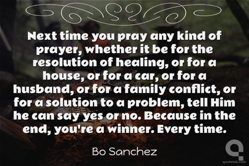 Next time you pray any kind of prayer, whether it be for the resolution of healing, or for a house, or for a car, or for a husband, or for a family conflict, or for a solution to a problem, tell Him he can say yes or no. Because in the end, you're a winner. Every time.
