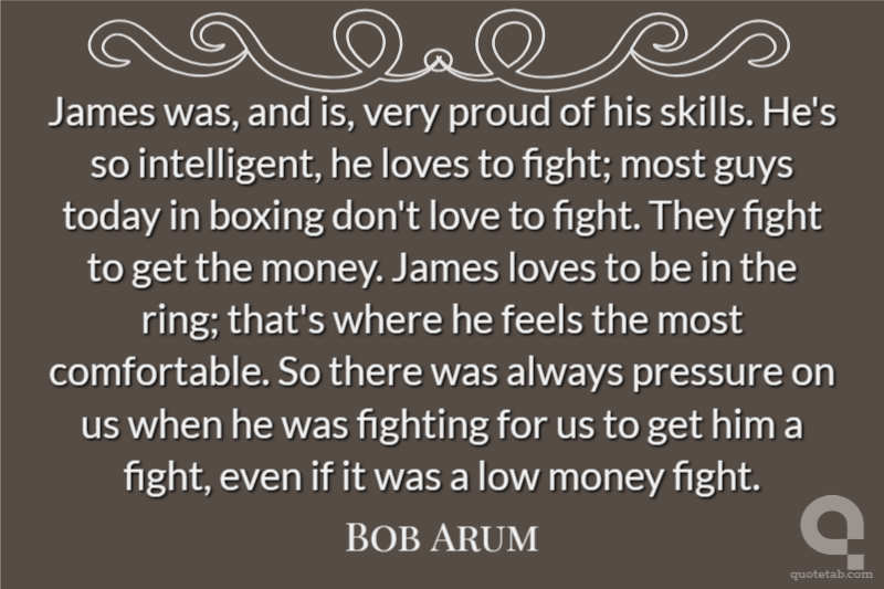 James was, and is, very proud of his skills. He's so intelligent, he loves to fight; most guys today in boxing don't love to fight. They fight to get the money. James loves to be in the ring; that's where he feels the most comfortable. So there was always pressure on us when he was fighting for us to get him a fight, even if it was a low money fight.
