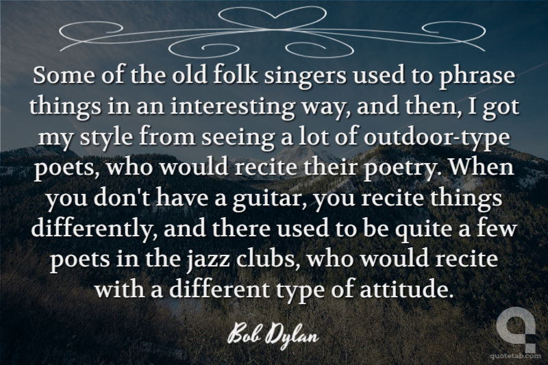 Some of the old folk singers used to phrase things in an interesting way, and then, I got my style from seeing a lot of outdoor-type poets, who would recite their poetry. When you don't have a guitar, you recite things differently, and there used to be quite a few poets in the jazz clubs, who would recite with a different type of attitude.