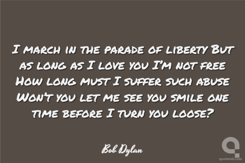 I march in the parade of liberty But as long as I love you I’m not free How long must I suffer such abuse Won’t you let me see you smile one time before I turn you loose?