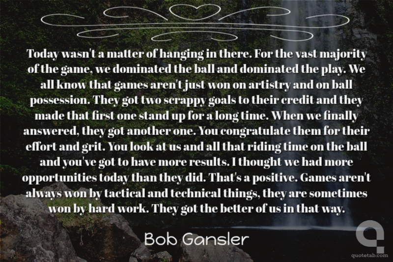 Today wasn't a matter of hanging in there. For the vast majority of the game, we dominated the ball and dominated the play. We all know that games aren't just won on artistry and on ball possession. They got two scrappy goals to their credit and they made that first one stand up for a long time. When we finally answered, they got another one. You congratulate them for their effort and grit. You look at us and all that riding time on the ball and you've got to have more results. I thought we had more opportunities today than they did. That's a positive. Games aren't always won by tactical and technical things, they are sometimes won by hard work. They got the better of us in that way.