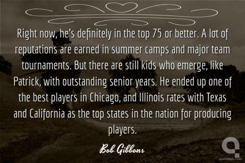 Right now, he's definitely in the top 75 or better. A lot of reputations are earned in summer camps and major team tournaments. But there are still kids who emerge, like Patrick, with outstanding senior years. He ended up one of the best players in Chicago, and Illinois rates with Texas and California as the top states in the nation for producing players.