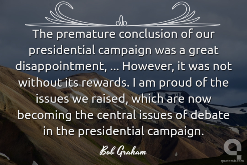 The premature conclusion of our presidential campaign was a great disappointment, ... However, it was not without its rewards. I am proud of the issues we raised, which are now becoming the central issues of debate in the presidential campaign.
