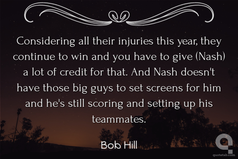 Considering all their injuries this year, they continue to win and you have to give (Nash) a lot of credit for that. And Nash doesn't have those big guys to set screens for him and he's still scoring and setting up his teammates.