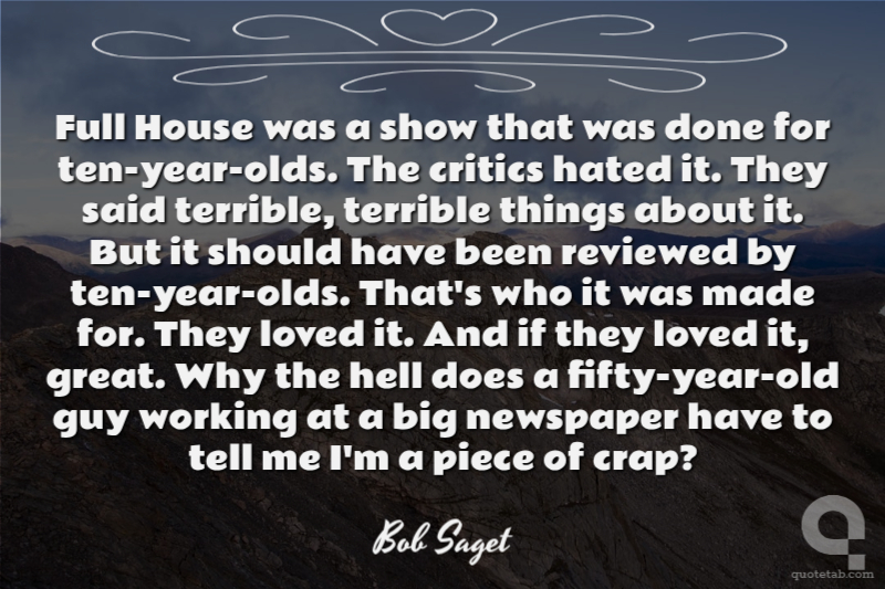 Full House was a show that was done for ten-year-olds. The critics hated it. They said terrible, terrible things about it. But it should have been reviewed by ten-year-olds. That's who it was made for. They loved it. And if they loved it, great. Why the hell does a fifty-year-old guy working at a big newspaper have to tell me I'm a piece of crap?