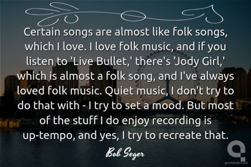 Certain songs are almost like folk songs, which I love. I love folk music, and if you listen to 'Live Bullet,' there's 'Jody Girl,' which is almost a folk song, and I've always loved folk music. Quiet music, I don't try to do that with - I try to set a mood. But most of the stuff I do enjoy recording is up-tempo, and yes, I try to recreate that.